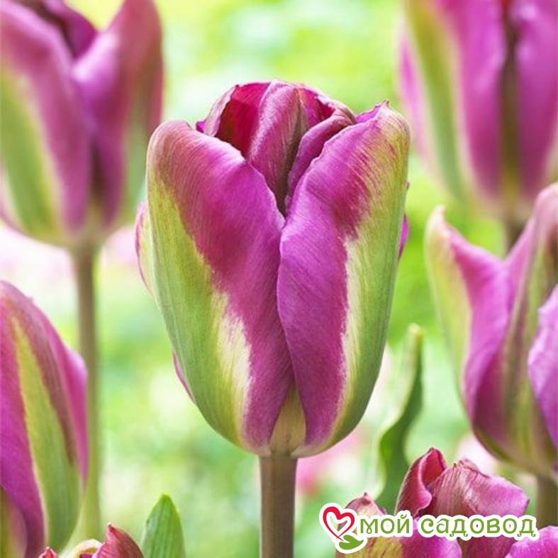 Тюльпан класса люкс.Относится к сорту зеленоцветковых. Экстравагантное сочетание цветов зеленого и фиолетового,очень удачный микс. Бокал крупный,порядка 9 см. В клумбах очень хорошо сочетается с белыми цветами. Высота тюльпана около 50 см.